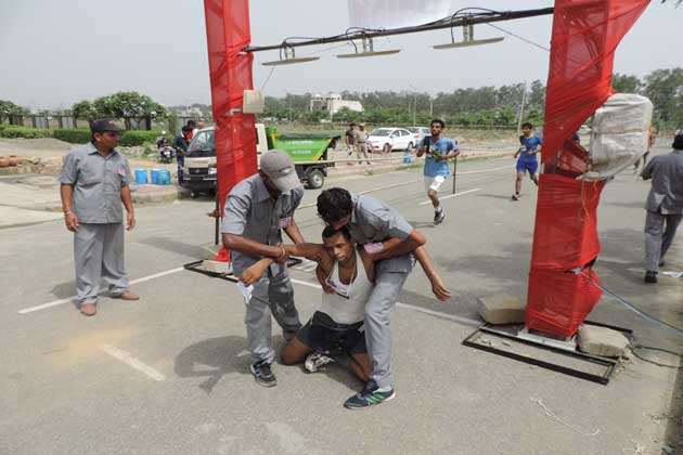 दौड़ के दौरान बेसुध हुए एक युवक को संभालते कर्मचारी।