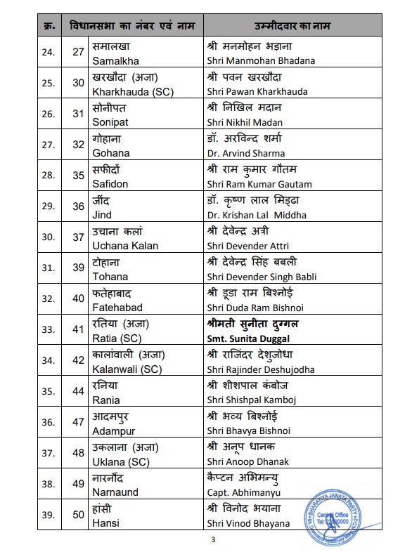 इस सूची में 67 नाम शामिल हैं। भाजपा की कोर कमेटी द्वारा मंथन के बाद उम्मीदवारों के नाम का एलान हुआ है। भाजपा लंबे समय से उम्मीदवारों के चयन के लिए स्क्रीनिंग बैठकें कर रही थी। सूची में हरियाणा भाजपा के पूर्व अध्यक्ष ओम प्रकाश धनखड़ को बादली और वरिष्ठ पार्टी नेता अनिल विज को अंबाला कैंट से मैदान में उतारा गया है।