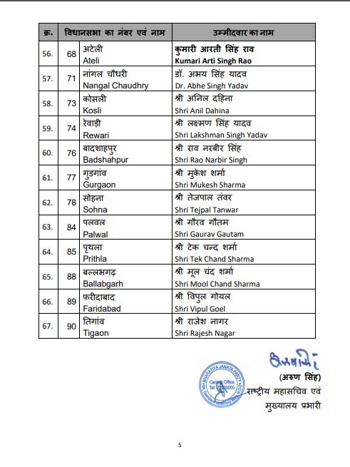 केंद्रीय मंत्री राव इंद्रजीत सिंह की बेटी आरती सिंह राव अटेली से चुनाव लड़ेंगी। कैप्टन अभिमन्यु, कुलदीप बिश्नोई के बेटे भव्य बिश्नोई और पूर्व सांसद सुनीता दुग्गल का नाम भी लिस्ट में है।