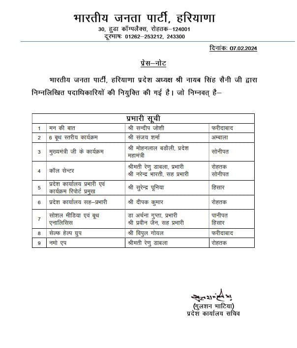 सोशल मीडिया एवं बूथ एनालिसिस की बात करें तो डॉ अर्चना गुप्ता, प्रभारी/पानीपत और प्रवीन जैन, सह प्रभारी/ हिसार को जिम्मेदारी दी गई है। सेल्फ हेल्प ग्रुप के लिए विपुल गोयल, फरीदाबाद का नाम सुझाया गया। जबकि नमो एप के लिए रेणु डाबला,रोहतक का नाम सामने आया।