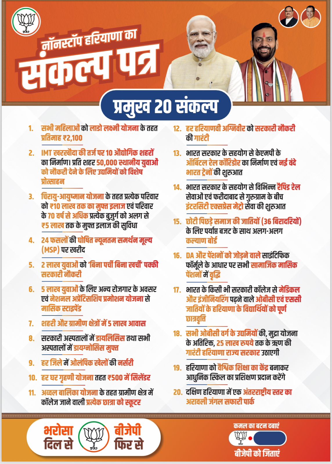भाजपा ने किसानों और युवाओं को साधते हुए अग्निवीरों व वंचित समुदायों पर भी विशेष ध्यान दिया है। भारतीय जनता पार्टी ने अपने घोषणा पत्र को नॉनस्टाप हरियाणा का संकल्प पत्र का नाम दिया है। इसमें भाजपा ने जनता से 20 वादे किए हैं।