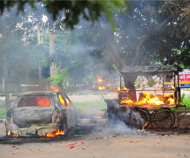 दमकल विभाग की गाड़ी के पहले शीशे तोड़े और फिर उसे आग लगा दी। इसके बाद तो फिर तांडव का ऐसा दौर चला कि रुकने का नाम नहीं लिया। एक के बाद एक कार, ओबी वैन, स्कूटर, मोटरसाइकिल जोकि सामने आया, उसे डेरा समर्थकों ने आग लगा दी। यह आग लगाने वालों में पुरुष या युवा ही नहीं, बल्कि महिलाएं बड़ी संख्या में थी। जिन्होंने पहले वाहनों को जमकर तोड़ा।