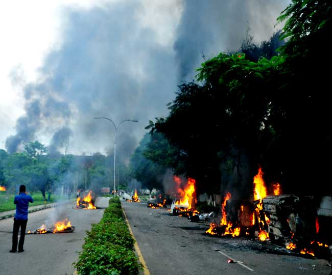 हिंसा के दौरान गाड़ियों में लगाई गई आग।