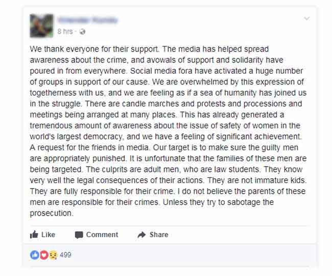 उन्होंने लिखा है कि हम जांच में किसी तरह का हस्तक्षेप नहीं करेंगे। हमारी मदद की जरूरत होगी तो हम मदद करेंगे। हम चाहते हैं कि आरोपियों को उनकी सजा मिले, हमें काफी दुख है कि उनके कर्मों की वजह से उनके परिवार को ये सब झेलना पड़ रहा है। उन्होंने लिखा कि मेरी बेटी ने इस मुद्दे पर आवाज उठा कर हिम्मत भरा काम किया है। अब हमें ये देखना होगा कि क्या हमारे देश में महिलाएं खुले में घूम सकती हैं और उनकी आवाज कोई सुनता है या नहीं। अगर उनकी आवाज नहीं सुनी जा रही है तो हम एक बिना कानून के समाज का हिस्सा हैं।