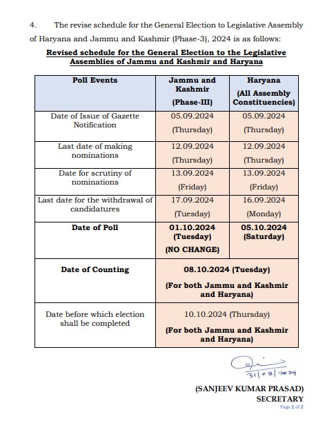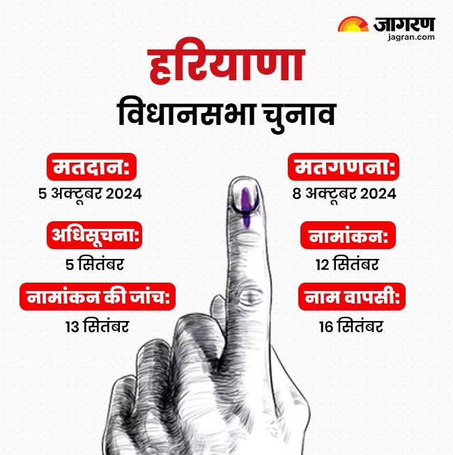 हरियाणा विधानसभा चुनाव के लिए सिर्फ मतदान और मतगणना की तारीखों में बदलाव हुआ है। अधिसूचना व नामांकन सहित नामांकन की जांच और नाम वापसी की तारीख वैसे ही रहेगी जैसे पहली थी।