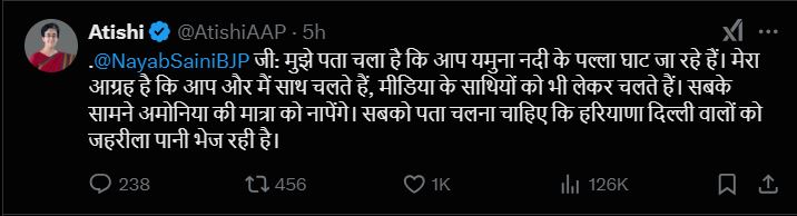 दिल्ली की मुख्यमंत्री ने नायब सिंह सैनी को संबोधित करते हुए पोस्ट में लिखा है, मुझे पता चला है कि आप यमुना नदी से पल्ला घाट जा रहे हैं। मेरा आग्रह है कि आप और मैं साथ चलते हैं। मीडिया के साथियों को भी लेकर चलते हैं। सबके सामने अमोनिया की मात्रा नापेंगे। सबको पता चलना चाहिए कि हरियाणा दिल्ली वालों को जहरीला पानी भेज रहा है। हरियाणा के मुख्यमंत्री नायब सिंह सैनी ने आतिशी की इस पोस्ट का जवाब दिया है।