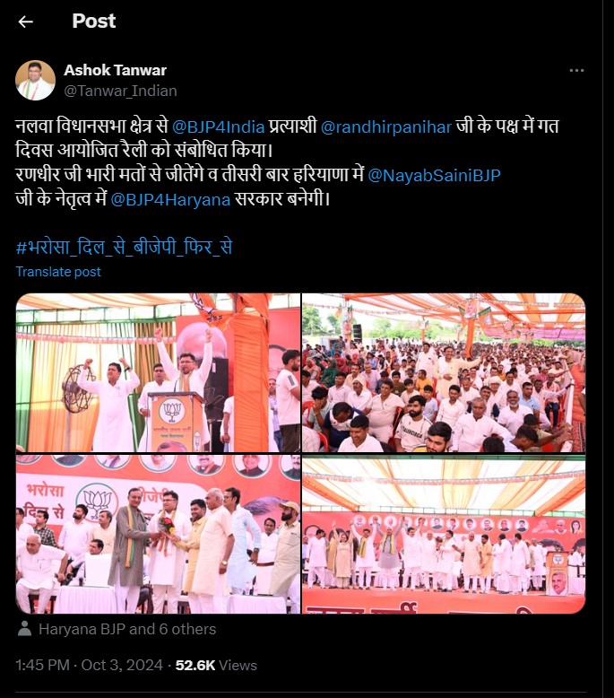 हैरानी की बात तो ये है कि अशोक तंवर ने दोपहर 1:45 पर खुद सोशल मीडिया पर पोस्ट शेयर कर लिखा था कि हरियाणा में लगातार तीसरी बार भी भाजपा की सरकार बनेगी। हालांकि, अपने इस पोस्ट के कुछ ही देर बाद उन्होंने खुद कांग्रेस का दामन थाम लिया।