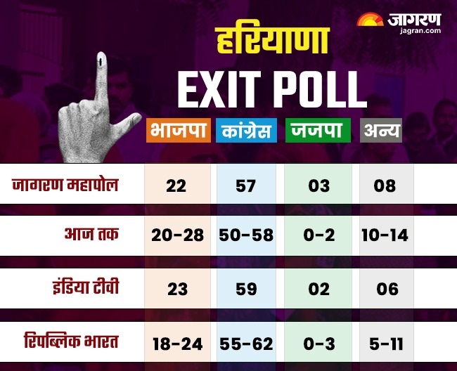 - रिपब्लिक भारत के अनुसार कांग्रेस को 55-62 सीटें मिल रही है, जबकि भाजपा को 18 से 24 सीटें मिल रही हैं तो जजपा को 0 से 3 सीटें मिलने का अनुमान है।