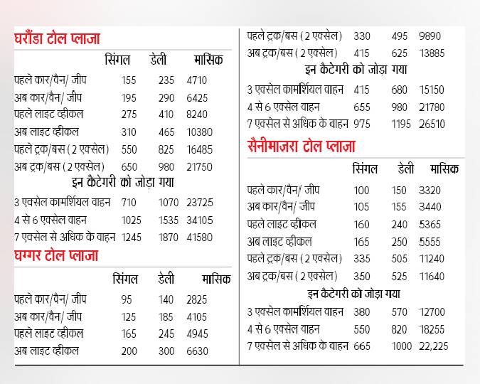 सिर्फ सिंगल यात्रा में ही नहीं मासिक पास के शुल्क में भी बढ़ोतरी की गई है। कामर्शियल वाहनों के लिए एक्सेल के हिसाब से दरों में वृद्धि की गई है। अंबाला के घग्गर नदी के पास फरवरी 2024 से किसान धरने पर बैठ गए थे, जिसके कारण यह टोल बंद था।