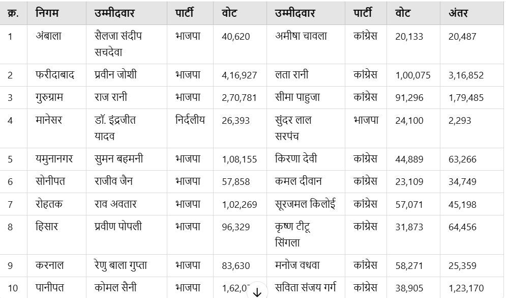 अंबाला में भाजपा की सैलजा संदीप सचदेवा, गुरुग्राम में भाजपा की राजरानी, मानेसर में निर्दलीय डा. इंद्रजीत यादव, यमुनानगर में भाजपा की सुमन बहमनी, सोनीपत में भाजपा के राजीव जैन, हिसार में भाजपा के प्रवीण पोपल, करनाल में भाजपा की रेणुबाला गुप्ता और पानीपत में भाजपा की कोमल सैनी ने नगर निगम में मेयर के चुनाव जीते हैं।