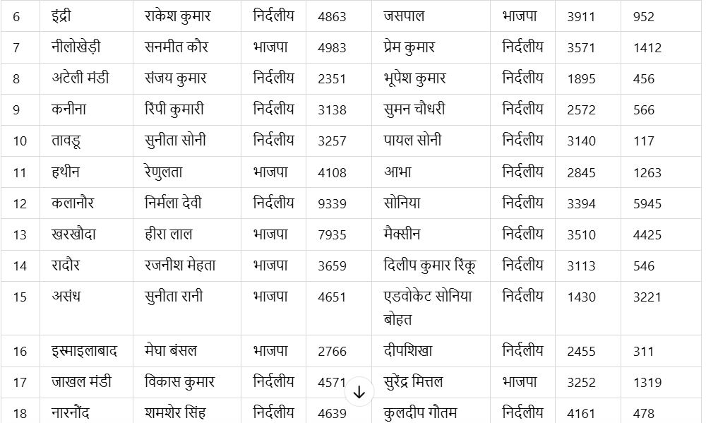 नोट: लोहारू, अटेली मंडी, कनीना, तावडू, कलानौर, जाखल मंडी, नारनौंद, बेरी, और सिवानी में कांग्रेस और भाजपा ने प्रत्याशी नहीं उतारे। पूंडरी में भाजपा की ममता 3226 वोटों के साथ तीसरे स्थान पर रहीं।