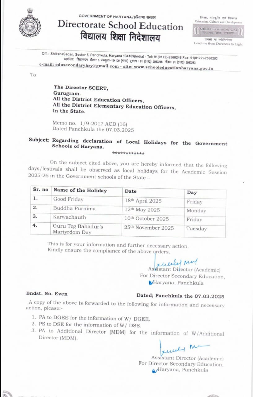 Haryana School Holidays हरियाणा सरकार ने प्रदेश के स्कूलों में चार दिन की छुट्टियों का एलान किया है। यह अवकाश विद्यार्थियों तथा शिक्षकों के लिए लागू होगा। 18 अप्रैल को गुड फ्राइडे 12 मई को बुद्ध पूर्णिमा 10 अक्टूबर को करवा चौथ तथा 25 नवंबर को गुरु तेग बहादुर शहीदी दिवस के अवसर पर राज्य के स्कूलों में अवकाश रहेगा।
