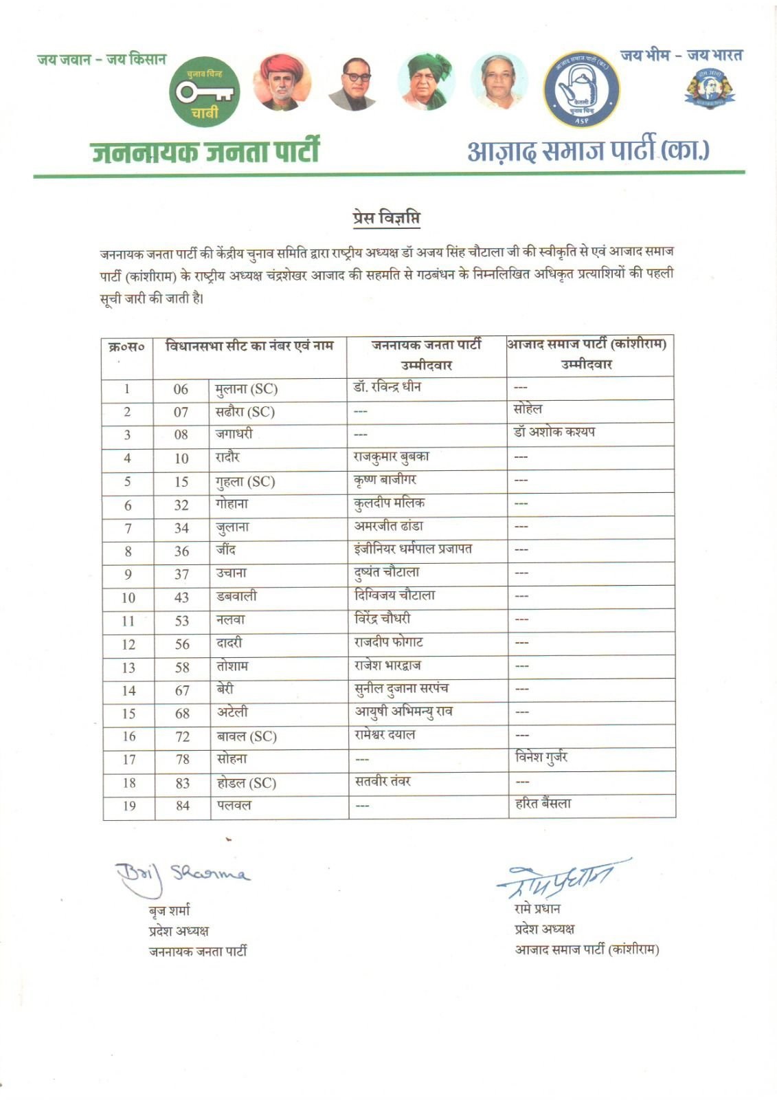 जननायक जनता पार्टी और आज़ाद समाज पार्टी के शीर्ष नेताओं द्वारा गठबंधन के प्रत्याशियों की दूसरी सूची जारी की है। सभी को बहुत बहुत शुभकामनाएँ ! pic.twitter.com/paQVi3V6za