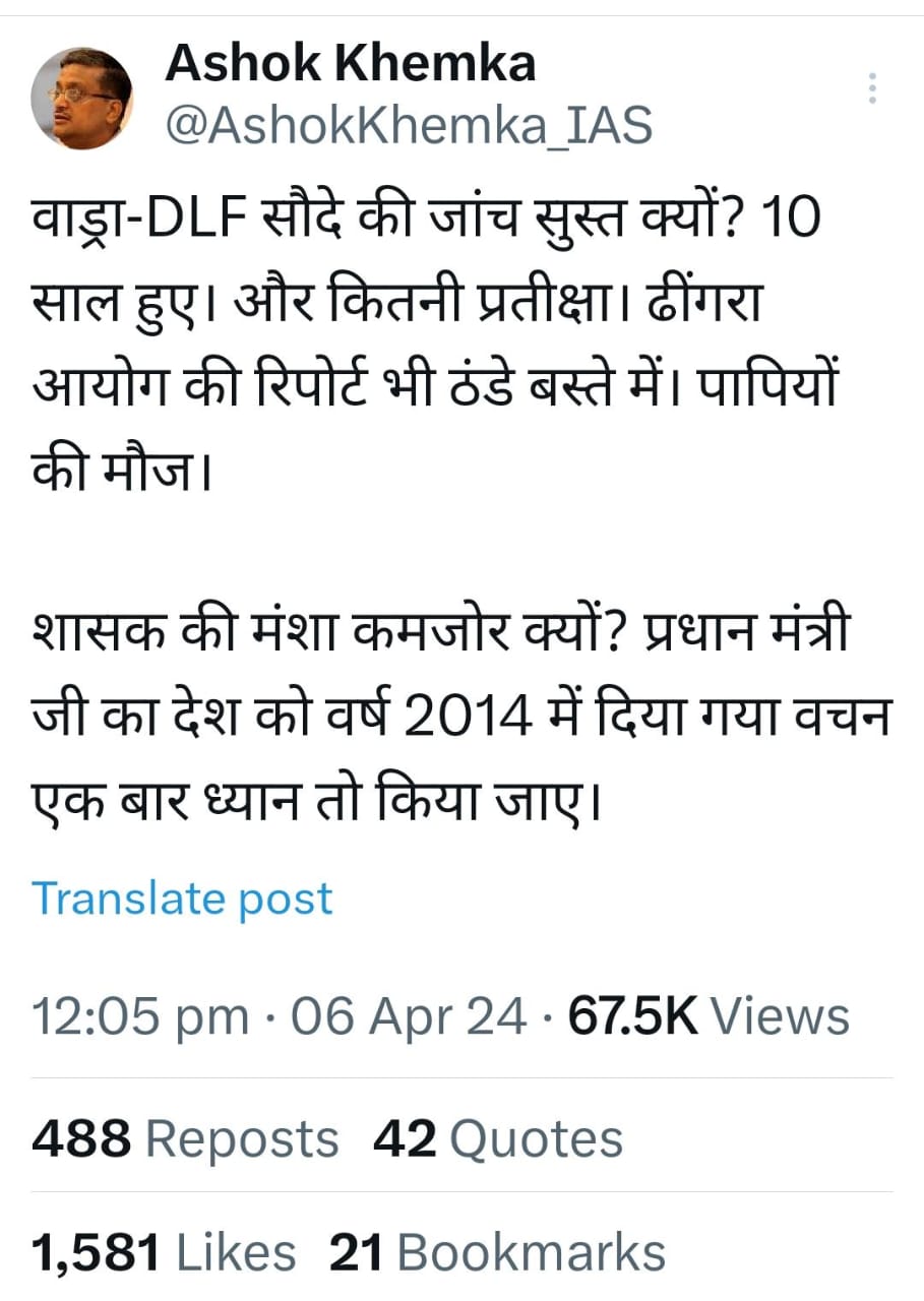 खेमका यही नहीं रूके। उन्होंने आगे लिखा कि शासक की मंशा कमजोर क्यों? प्रधानमंत्री का देश को वर्ष 2014 में दिया गया वचन एक बार ध्यान तो किया जाए। इससे पहले खेमका ने पिछले साल भी डीएलएफ लैंड डील मामले पर सवाल खड़े किए थे, जिसके बाद सरकार की ओर से जांच के लिए एसआईटी गठित की गई थी।