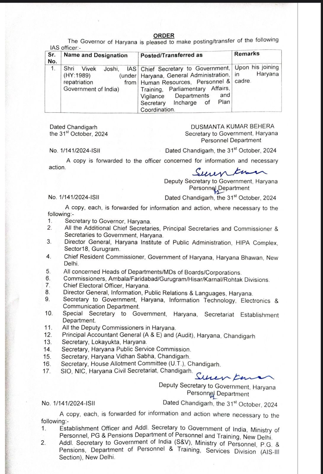 राज्य सरकार के एक आदेश के अनुसार, भारत सरकार से प्रत्यावर्तन के तहत जोशी को राज्य कैडर में शामिल होने पर हरियाणा सरकार के मुख्य सचिव के रूप में तैनात किया गया है। जोशी मौजूदा मुख्य सचिव टीवीएसएन प्रसाद का स्थान लेंगे। वह1988 बैच के आईएएस अधिकारी हैं और आज (गुरुवार) इस पद से सेवानिवृत्त हुए हैं।