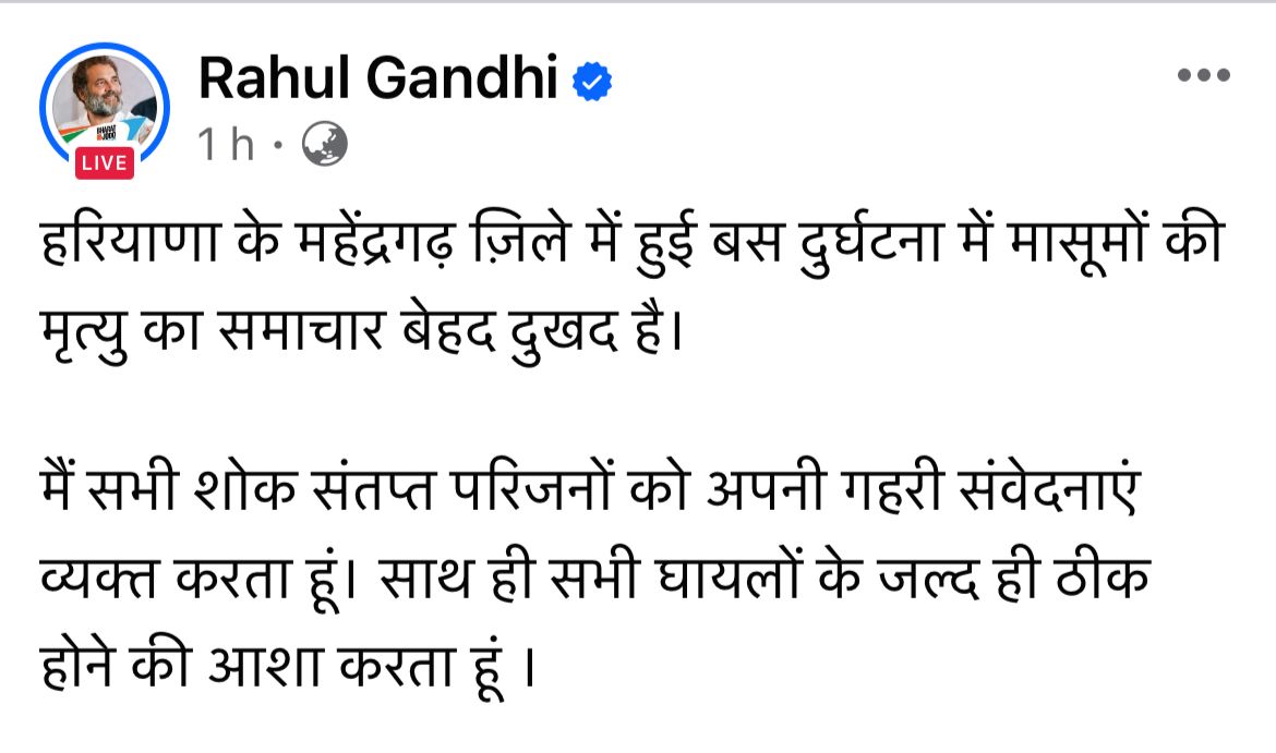 कांग्रेस नेता और सांसद राहुल गांधी (Rahul Gandhi) ने सोशल मीडिया पर लिखा कि हरियाणाा के महेंद्रगढ़ में हुई बस दुर्घटना में मासूमों की मौत का समाचार बेहद दुखद है। मैं सभी शोकसंतप्त परिजनों को अपनी गहरी संवेदनाए व्यक्त करता हूं। साथ ही सभी घायलों के जल्द ही ठीक होने की आशा करता हूं।