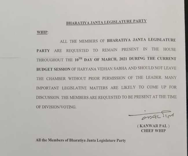 भाजपा द्वारा अपने विधायकों को जारी किया गया व्हिप।