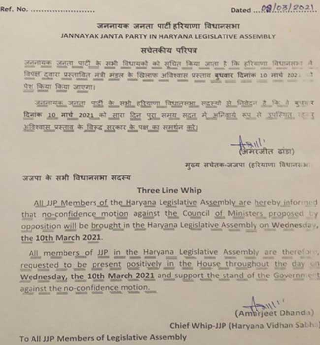 दूसरी ओर, जजपा ने भी अपने सभी 10 विधायकों को व्हिप जारी कर 10 मार्च को विधानसभा में मौजूद रहने का निर्देश दिया गया है। जजपा द्वारा विधायकों को भी जारी व्हिप में कहा गया है कि विपक्ष द्वारा 10 मार्च को मंत्रिमंडल के खिलाफ प्रस्तावित अविश्वास प्रस्ताव के मद्देनजर जजपा के सभी विधायक विधानसभा में मौजूद रहें और सरकार के पक्ष और अविश्वास प्रस्ताव के खिलाफ वोटिंग करें। माना जा रहा है कांग्रेस भी अपने विधायकों को व्हिप जारी करेगी।