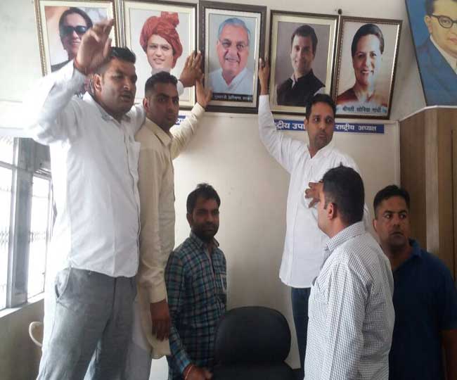 हिसार के कांग्रेस भवन में हुड्डा कर हटाई गई तस्वीर को दाेबारा लगाते उनके समर्थक।