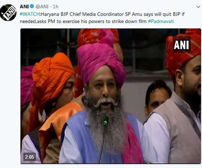 फिल्‍म पद्मावती के विरोध में हरियाणा भाजपा का एक और नेता सामने आया है। हरियाणा भाजपा के मीडिया कॉडिनेटर सूरजपाल अमू ने फिल्‍म को रिलीज न हाेने देने क ...और पढ़ें