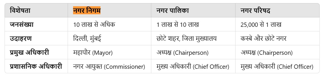 शहरों को नगर निगम, नगर पालिका और नगर परिषद के रूप में बांटा गया है। अगर कोई जगह छोटा कस्बा है तो वहां नगर परिषद (Nagar Parishad) होगा। अगर वह थोड़ा बड़ा और विकसित शहर है तो वहां नगर पालिका (Municipality) होगी। अगर वह बहुत बड़ा शहर या महानगर है तो वहां नगर निगम (Muncipal Corporation) होगा।