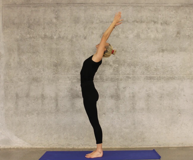 2- कंधे ढीले छोड़ें, पीठ सीधी रखें, पंजों के बल खड़े हों