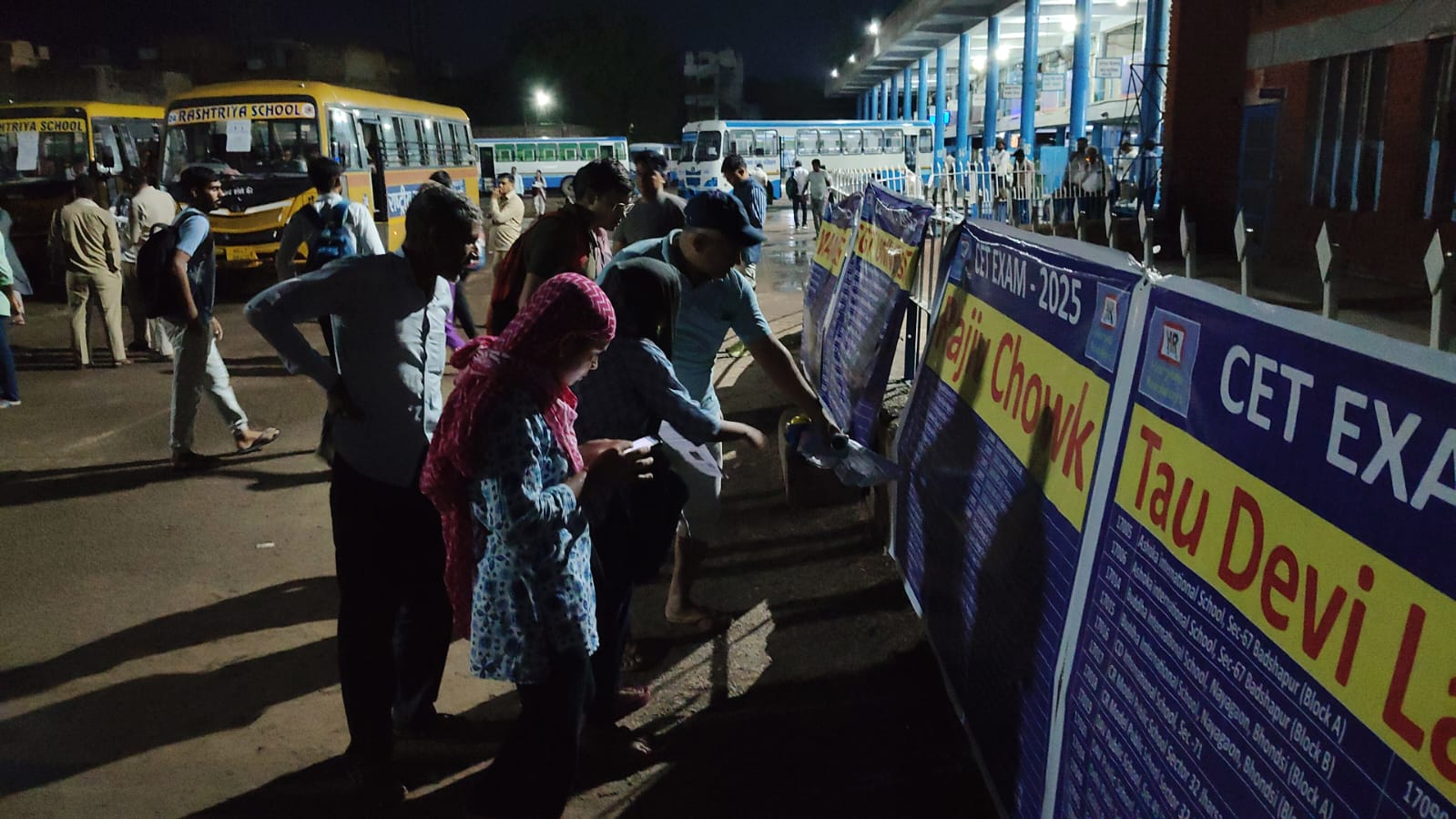 दूसरे जिलों में परीक्षा देने के लिए जाने वाले अभ्यार्थी रूट चेक करते हुए।
