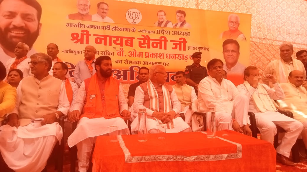 जागरण संवाददाता, रोहतक। हरियाणा बीजेपी के नवनियुक्त प्रदेशाध्यक्ष नायब सिंह सैनी (BJP president Nayab Saini) ने सोमवार को रोहतक में पदभार संभाला। कार्यक्रम में मुख्यमंत्री मनोहर लाल, प्रभारी त्रिपुरा के पूर्व मुख्यमंत्री विप्लव देब, पूर्व अध्यक्ष और राष्ट्रीय सचिव ओमप्रकाश धनखड़ भी मौजूद हैं।