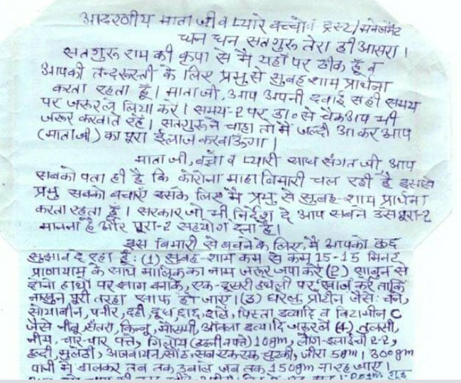 गुरमीत सिंह द्वारा लिखी गई चिट्ठी में मां को अपने स्वास्थ्य की जांच कराने के साथ-साथ समय पर दवा लेते रहने की सलाह दी है। साथ ही, कुछ सुझाव भी दिए हैं। उनसे मां से कहा है कि वह सुबह-शाम 15-15 मिनट प्राणायाम करें और भगवान के नाम जपने करें। कोरोना वायरस के खतरे से बचने के लिए साबुन से हाथ धोने के साथ व घर का पौष्टिक आहार लेने को भी कहा है।