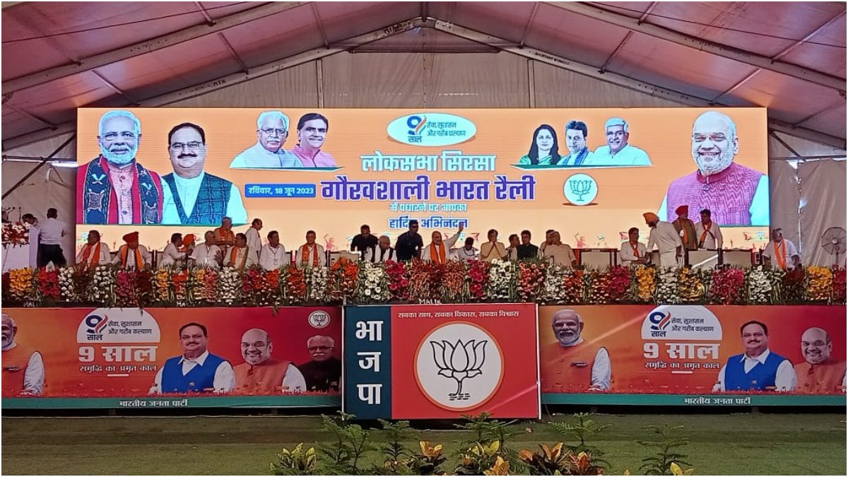 बता दें कि गौरवशाली भारत रैली में पहुंचे केंद्रीय गृह मंत्री अमित शाह का मुख्यमंत्री मनोहर लाल ने पगड़ी पहनाकर स्वागत किया। केंद्रीय मंत्री गजेंद्र सिंह शेखावत, बीजेपी प्रदेश प्रभारी बिपल्ब देव, प्रदेश अध्यक्ष ओमप्रकाश धनखड़ भी कार्यक्रम में मौजूद हैं।
