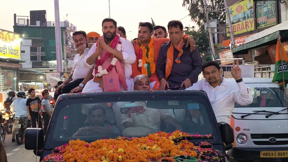 जीत के बाद शहर में विजयी जुलूस निकालते भाजपा विधायक निखिल मदान।