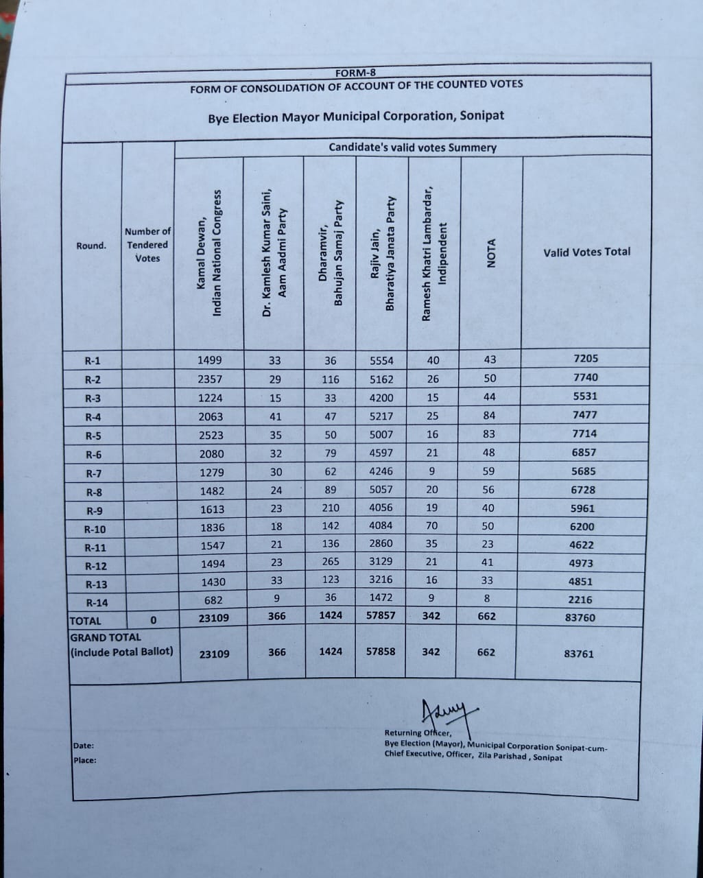 सोनीपत मेयर उप चुनाव का राउंडवार लेखा- जोखा