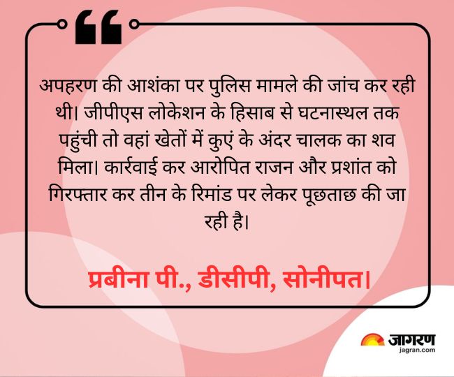 अपहरण की आशंका पर पुलिस (Sonipat Police) मामले की जांच कर रही थी। जीपीएस लोकेशन के हिसाब से घटनास्थल तक पहुंची तो वहां खेतों में कुएं के अंदर चालक का शव मिला। कार्रवाई कर आरोपित राजन और प्रशांत को गिरफ्तार कर तीन के रिमांड पर लेकर पूछताछ की जा रही है। प्रबीना पी., डीसीपी, सोनीपत।