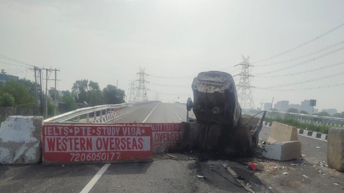 #Sonipat में भीषण सड़क हादसा। बीच सड़क पर रखे सीमेंटेड बैरिकेड से टकराने के बाद कार में लगी आग। जिंदा जले 3 डाक्टर, दो की हालत गंभीर। सभी PGI रोहतक में MBBS अंतिम वर्ष के छात्र थे।@JagranNews @police_haryana @SonipatPolice