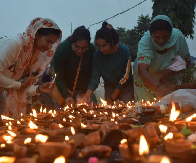 कपालमोचन गुरुद्वारा साहिब के बाहर दीपदान करते श्रद्धालु। जागरण।