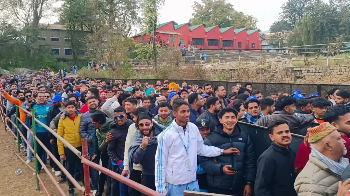 धर्मशाला स्टेडियम में एंट्री के लिए उमड़ी लोगों की भीड़। जागरण