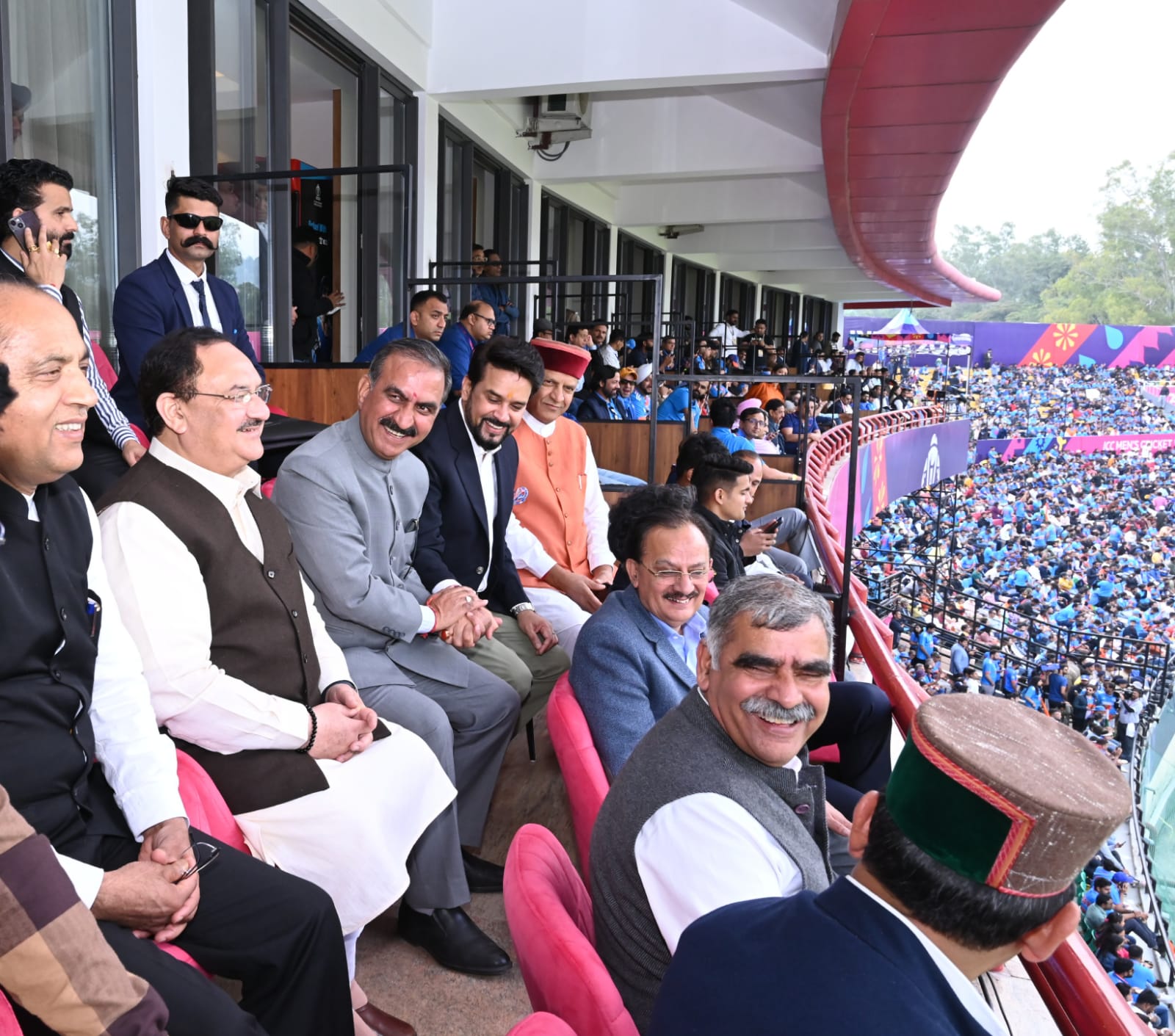 क्रिकेट स्टेडियम में भाजपा के राष्ट्रीय अध्यक्ष जगत प्रकाश नड्डा, केंद्रीय मंत्री अनुराग ठाकुर, भाजपा प्रदेश अध्यक्ष डा. राजीव बिंदल, पूर्व मुख्यमंत्री जयराम ठाकुर, प्रदेश के मुख्यमंत्री सुखविंदर सिंह सुक्खू, उद्योग मंत्री हर्षवर्धन चौहान, ज्वालामुखी के विधायक संजय रत्न व अन्य ने भारत-न्यूजीलैंड क्रिकेट मैच एक साथ बैठकर देखा।
