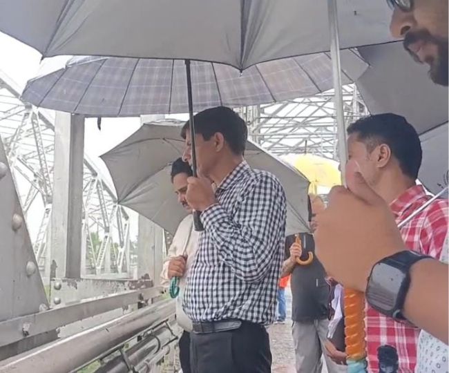 चक्की दरिया पर क्षतिग्रस्त पुल का निरीक्षण करते इंजीनियर।