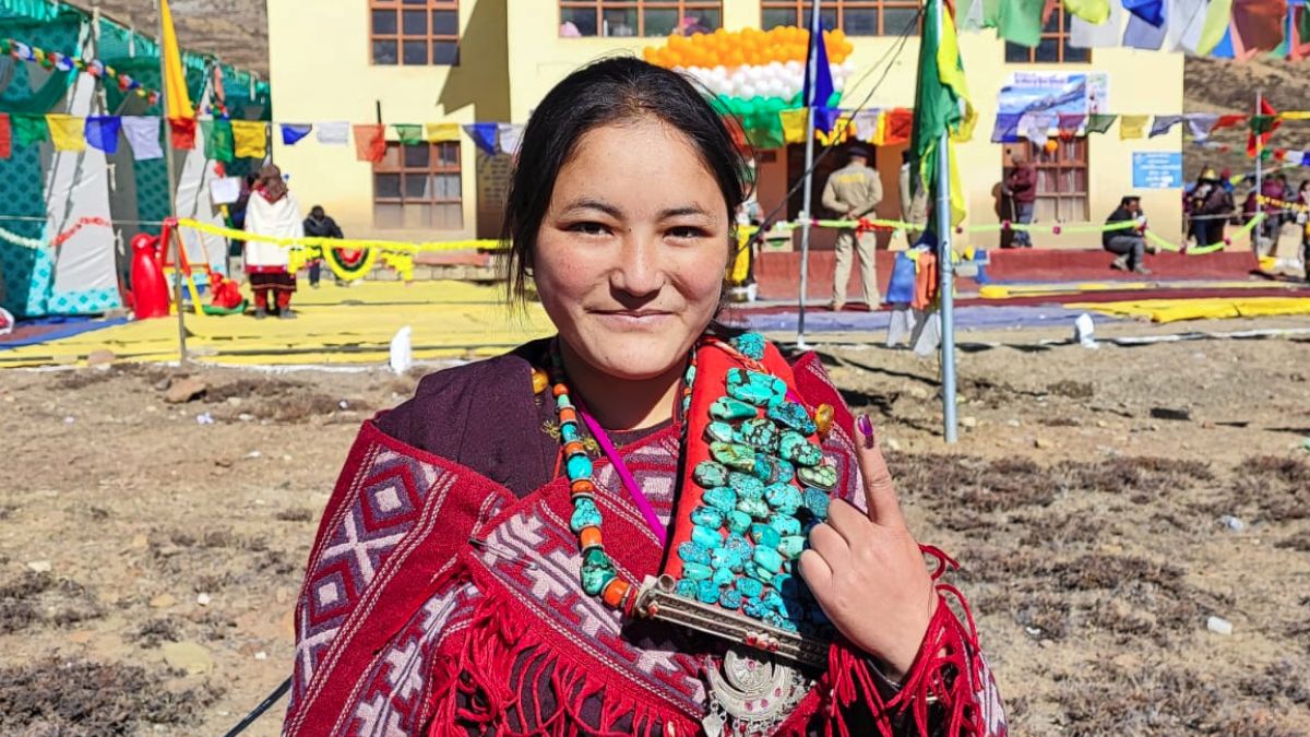 टशीगंग पोलिंग स्टेशन पर मतदताओं के स्वागत के लिए लगाया गया गेट और स्वागत को खड़ी युवतियां।
