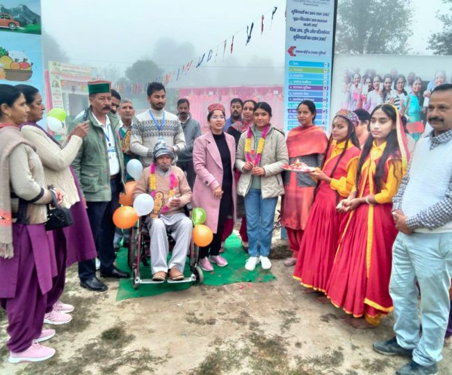 जिला मंडी के बल्ह विधानसभा क्षेत्र के तहत व्हील चेयर पर मतदान करने पहुंचे बुजुर्ग मतदाता का स्वागत करती पोलिंग टीम। मतदान केंद्रों के बाहर कारपेट बिछाकर मतदाताओं का स्वागत किया गया।