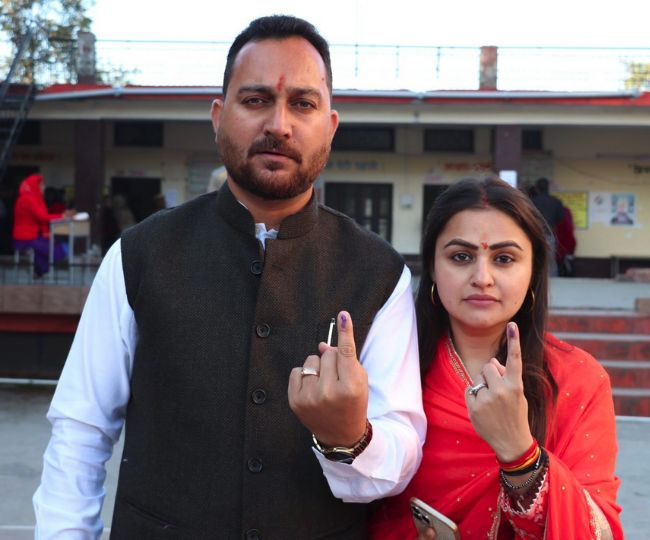 हमीरपुर विधानसभा क्षेत्र से निर्दलीय प्रत्याशी आशीष शर्मा पत्नी के साथ वोट डालने के बाद अंगुली पर लगी स्याही दिखाते हुए। आशीष ने हमीरपुर में मुकाबला रोचक बना दिया है। वह भाजपा व कांग्रेस प्रत्याशियों को कड़ी टक्कर दे रहे हैं।