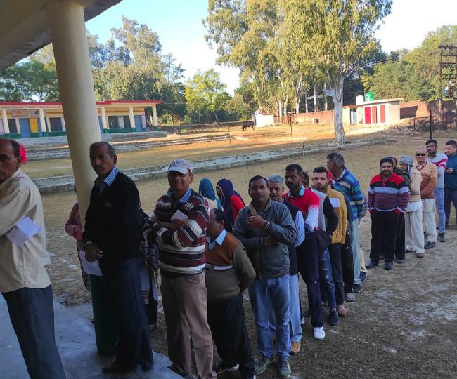जिला कांगड़ा के जसवां परागपुर विधानसभा क्षेत्र के तहत नंगल चौक में सुबह पोलिंग बूथ पर लगी मतदाताओं की लंबी लाइन।