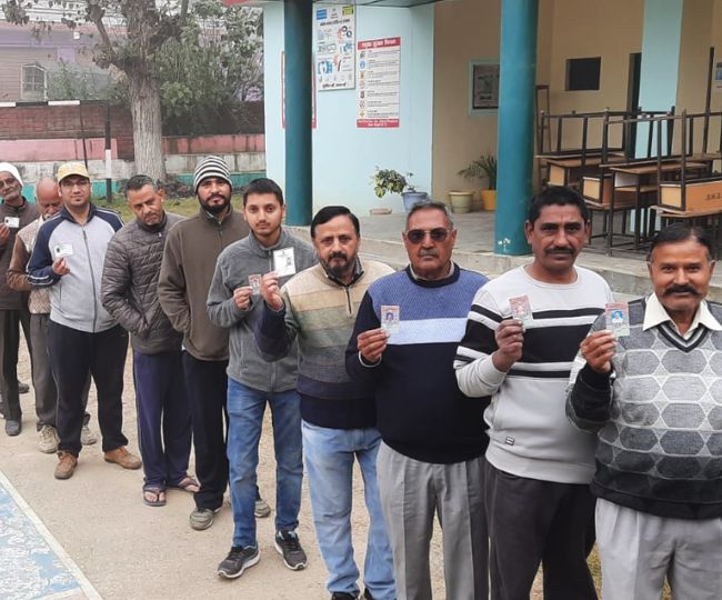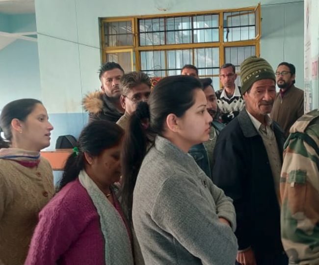 जिला कांगड़ा के कांगड़ा विधानसभा क्षेत्र में सुबह ही मतदान करने के लिए पहुंचे लोग।