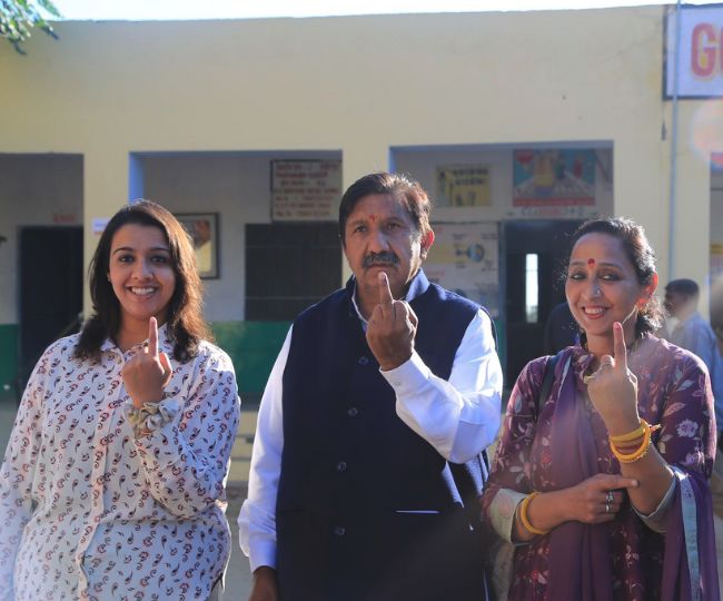 नेता प्रतिपक्ष हिमाचल प्रदेश अपने विधानसभा क्षेत्र में हरोली में मतदान करने के बाद पत्नी व बेटी के साथ। कांग्रेस प्रत्याशी मुकेश ने सुबह ही मतदान कर लोगों को वोट डालने का संदेश दिया।