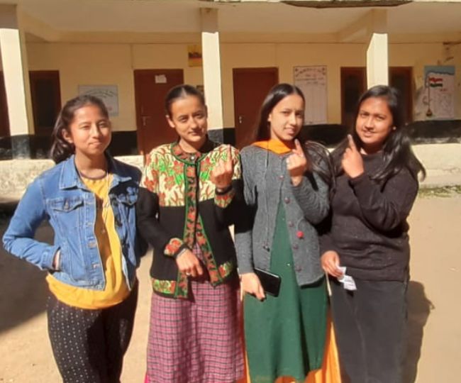 जिला शिमला कसुंपटी विधानसभा क्षेत्र के तहत बल्देयां में पहली बार वोट डालने के बाद खुश युवतियां। इन्होंने कहा कि वह मतदान करने के लिए काफी उत्साहित थीं।