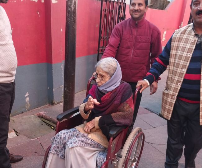 जिला शिमला के एक मतदान केंद्र पर व्हील चेयर पर बैठकर मतदान करने पहुंची 83 वर्षीय निर्मल ठाकुर।