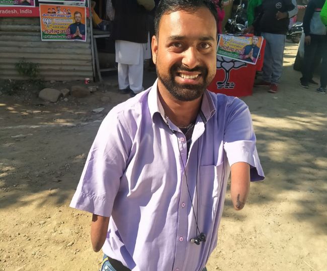 दिव्यांग विनोद भराड़ी आदर्श मतदान केंद्र में मतदान करने के बाद।