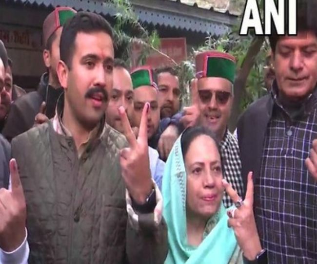 शिमला ग्रामीण के विधायक विक्रमादित्य सिंह व कांग्रेस प्रदेश अध्यक्ष एवं उनकी मां प्रतिभा सिंह वोट डालने के बाद विजय चिन्ह बनाते हुए।