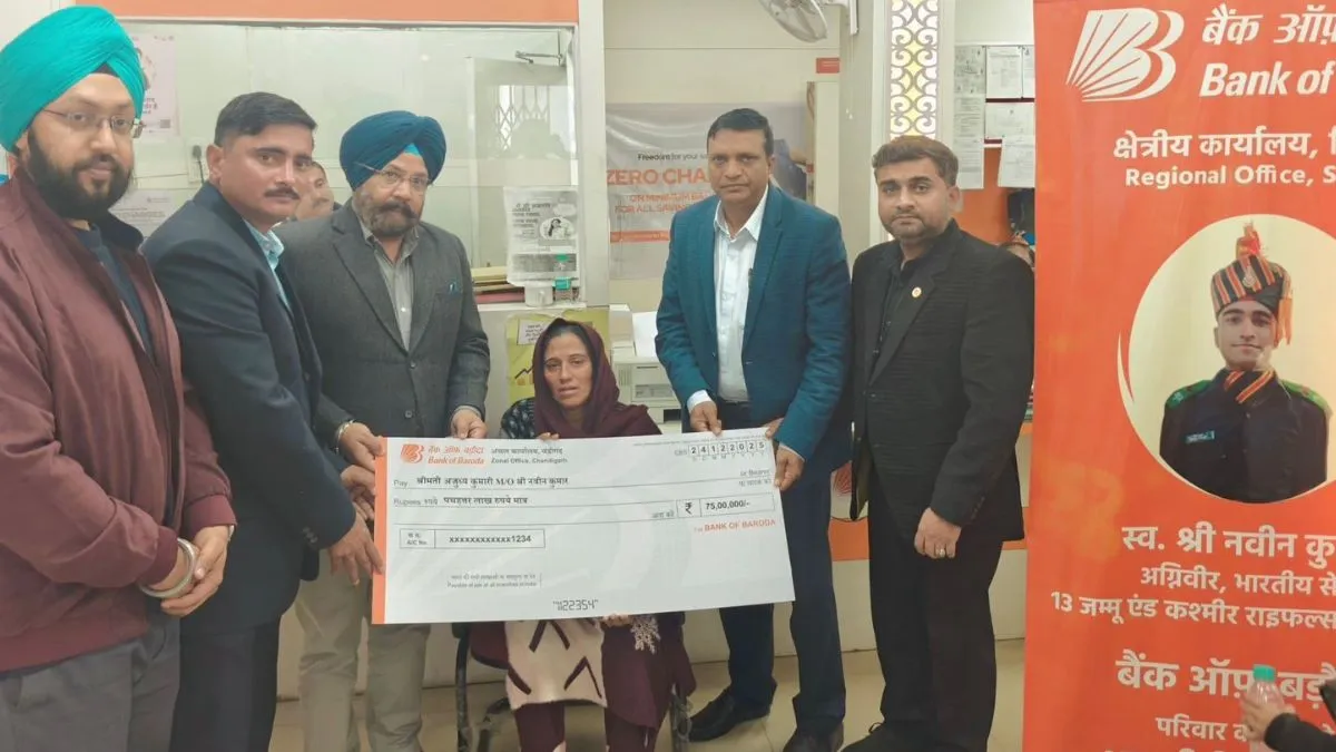 बैंक आफ बड़ौदा ने अग्निवीर खाता योजना के तहत व्यक्तिगत दुर्घटना बीमा कवर के तहत उनके स्वजन को पालमपुर में 75 लाख रुपये की वित्तीय सहायता प्रदान की। यह बीमा राशि एक गरिमामय एवं भावपूर्ण समारोह के दौरान बलिदानी की माता अजूधिया देवी को दी गई।