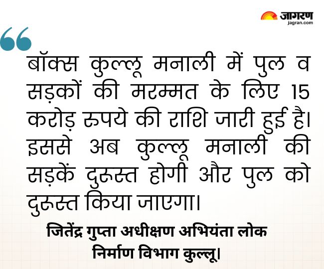 इन मकान मालिकों को राहत राशि प्रदान की गई थी। यह आपदा 31 जुलाई को आई, जिसमें बागीपुल में सबसे अधिक नुकसान हुआ, जहां पर नौ लोगों की मौत हो गई थी। अभियंता लोक निर्माण विभाग कुल्लू के अधीक्षण जितेंद्र गुप्ता ने कहा कि बॉक्स कुल्लू मनाली में पुल व सड़कों की मरम्मत के लिए 15 करोड़ रुपये की राशि जारी हुई है। इससे अब कुल्लू मनाली की सड़कें दुरूस्त होगी और पुल को दुरूस्त किया जाएगा।